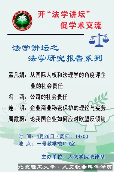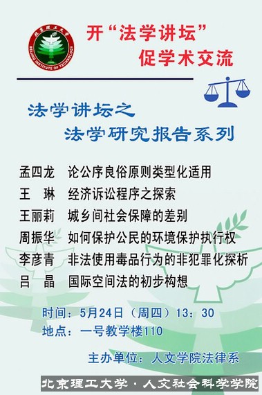 自4月19日始至5月24日,人文学院法学讲坛共分四坛,坛坛飘香呈现在师生面前。在这一系列活动中,上至学院副院长、副书记以及各位教授、导师,下至全体同学,齐心参与、各献其力,开创了人文学院新的学术氛围,为我校综合性大学人文素养的培育作出了力所能及的努力。