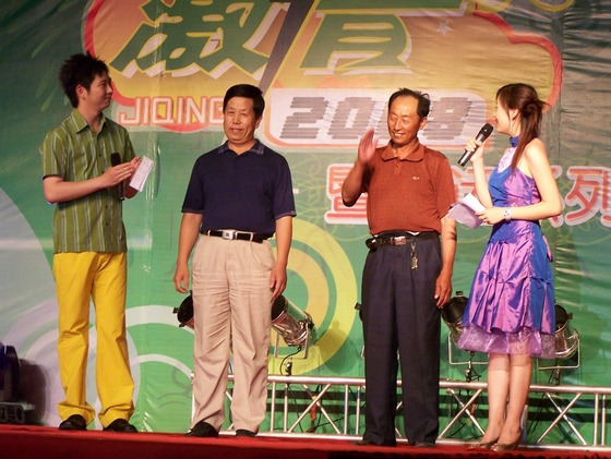 我们有幸请来了建造国家体育馆“鸟巢”工程的工工程师及工人,他们五年来忙碌在建筑工地上,甚至没有时间回家,全场同学向他们表达了真切的关怀与敬佩,我们通VCR过给他们带来了演绎明星的亲切问候。此时此刻,全场师生沉浸在浓浓的迎奥运的情怀之中。