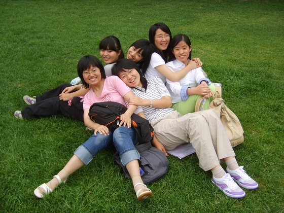 席地而坐,在茵茵绿地上,多么亲密的宿舍小家庭