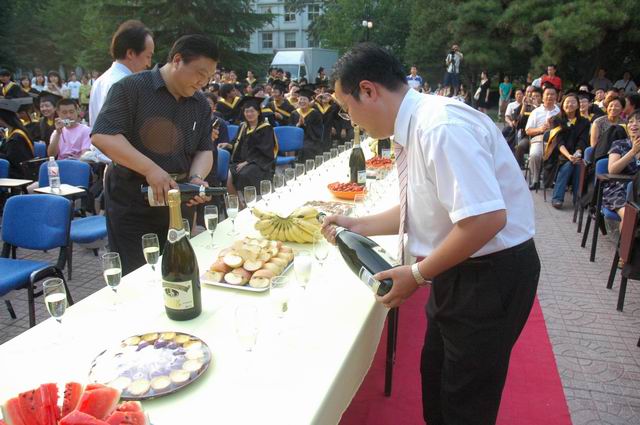 7月11日下午5:30,夕阳西下,化工与环境学院在中心花园隆重召开了2007届本科生毕业典礼。校友会主任杨晖、校团委副书记代方震、保卫处副处长康明应邀参加,学院院领导、各系主任、党支部书记及一线教师、机关教师及学院全体2003届毕业生参加了典礼,学院还邀请了学生家长同同学一起参加毕业庆典,50余名学生家长不远千里从全国各地赶来参加孩子的毕业庆典,毕业典礼借鉴了西方国家的毕业典礼,办成了一个毕业酒会,同学与自己的亲友、恩师一同分享成功的喜悦,并向他们表示了深深的感激,学会了感恩,这也是学院毕业教育的一个重要环节。