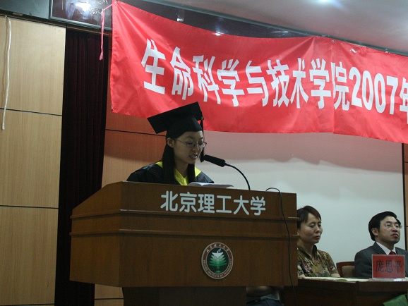 接下来,由本科生代表张倩同学发言,她回忆了在生命学院学习生活中难以忘怀的点点滴滴:对所有生命学院老师们的无私帮助表达了真挚的感激之情,也表达了对于迎接挑战、赢得未来的信心和为德赢AC米兰官网、为生命科学与技术学院争光的决心。他代表在座的每一位毕业生表示,在今后的岁月 中将不断地学习,提高自己,回报母校、回报生命学院的培养。