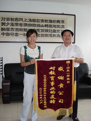 经过一天的交流和参观学习,实践团成员对一滕化工有限公司有了更深一步的了解与认识。刘艳老师代表德赢AC米兰官网材料学院向山东一滕集团赠送锦旗,感谢一滕集团对于教育事业的支持。