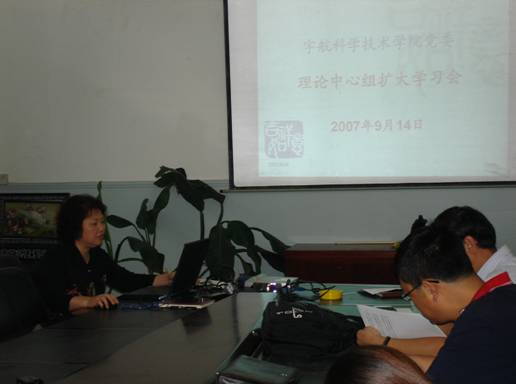 为深入学习贯彻胡锦涛总书记在中央党校的重要讲话精神,全面落实科学发展观,在思想上紧跟时代步伐,同时也为更加深入全面地了解学校全面工作,进一步解放思想,扎实工作,以实际行动迎接党的十七大胜利召开,宇航科学技术学院于2007年9月14日进行了理论中心组扩大学习会。参加此次学习的有学院分党委书记刘淑艳、院长黄风雷、常务副院长焦清介等学院领导班子成员及学院教工党支部书记、系主任及常务副主任。