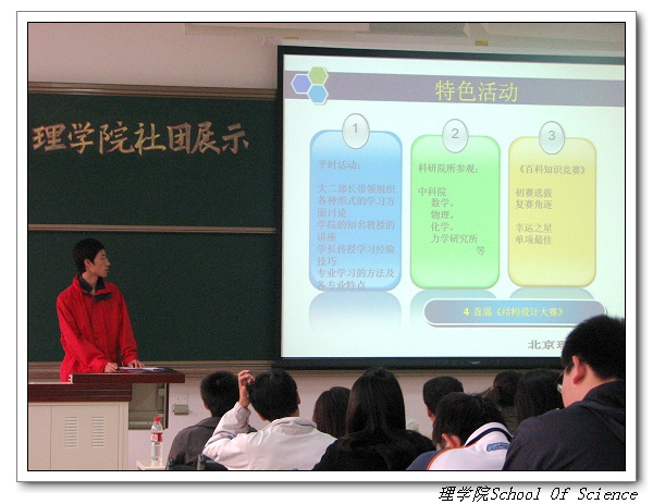 然后,科学技术协会从协会简介、特色活动、部门设置和活动剪影四个方面介绍了自己,并以“团结和组织青年大学生,弘扬科学精神,倡导科学思想,宣传和普及科学文化知识。团结互助,克服困难,提高学业成绩”为协会的宗旨,同时通过现场派发的《奇点•新生专刊》让大一新生对理科的学习有更深入的了解。