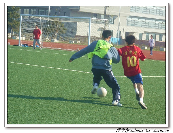 一改理学院小场足球赛的风格,我院2007级数学系同学组成数学联队,对阵我院2007级物、力、化三系联队,一声哨响,比赛开始,不一会三系联队就组织起了几次漂亮的进攻,对数学联队的城门进行狂轰乱炸,创造了好几次绝佳的进球机会,数学系的同学并不示弱,沉着冷静,不急不躁,对自家禁区严防死守,还不时来个防守反击,比赛如火如荼的进行着,终于在上半场快结束时,三系联队抓住对手后防空虚的机会,果断进攻,前锋队员在队友的助攻下,终于打破僵局,上半场就在三系联队领先一球的情况下结束了。