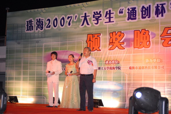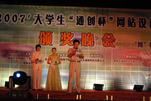 2007年10月27日晚,鲜花、气球、彩带把德赢AC米兰官网珠海学院运动场装扮得热闹非凡,由珠海市大学园区工作委员会、珠海市科技局主办,德赢AC米兰官网珠海学院承办,珠海市通创电子科技有限公司协办的“珠海2007ˊ大学生‘通创杯’网站设计大赛”颁奖晚会在这里盛大举行,中共珠海市大学园区工作委员会书记、珠海市大学园区工作委员会主任钟国胜、珠海市科技局局长邱轼、珠海学院院长董兆钧、珠海市软件行业协会秘书长岳乃正、珠海市高新技术创业服务中心主任阎武等领导和嘉宾以及来自各高校的3000多名学生参加了晚会。