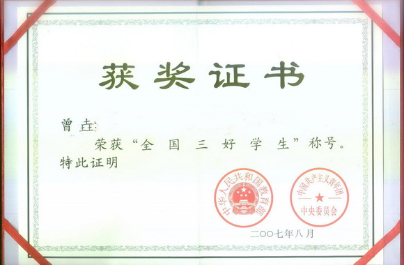 从2007年8 月开始,教育部、共青团中央组织在全国普通高等学校和中等职业学校中开展第九次“全国三好学生”、“全国优秀学生干部”、“全国先进班集体”评比活动。我校信息科学技术学院光电工程系的2003级曾垚同学顺利通过了学校、北京市、教育部三级评审,最终获得了“全国三好学生”荣誉称号。