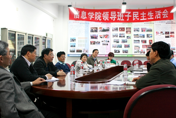 信息学院党政领导近期召开了领导班子民主生活会,结合届中考核反馈的意见以班子的分工协调配合,提高整体效能增进和谐为主题进行沟通、交流。会议由学院党委书记薛唯同志主持。会上大家紧紧围绕主题,坦诚相见、消除顾虑、畅所欲言,认真开展了批评与自我批评。