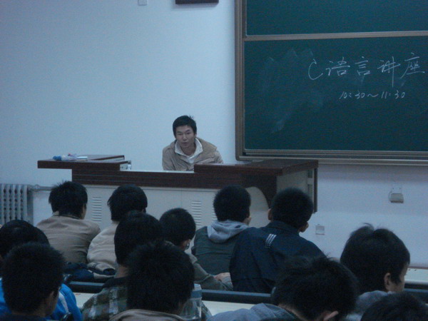 天高云淡清风爽,C林高手聚良乡。2007年12月1日,软件学院科学技术协会主办的C语言学习讲座在良乡校区理科教学楼301教室举行。本次讲座请到了软件学院2006级学生、听网杯程序设计大赛一等奖获得者王锐坚同学主讲。活动吸引了不少初涉C语言编程的同学,大家争相前来一睹冠军风采,并汲取有益的编程经验。