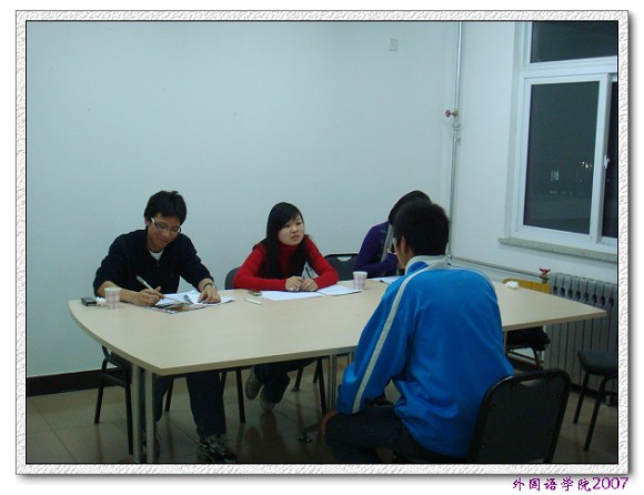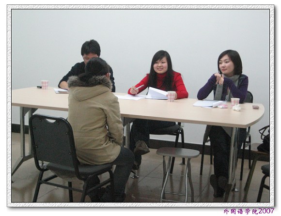 担任此次英语口语专业测试的评委是来自外国语学院中关村校区的高年级英语专业学长,他们用专业的技能,热情的态度,认真的评判;参加面试的同学们也都是充满信心和激情,很多同学很早就来到面试现场,积极准备。经过英语口语专业测试,外国语学院2007级选拔出20名同学参加了综合知识考试。