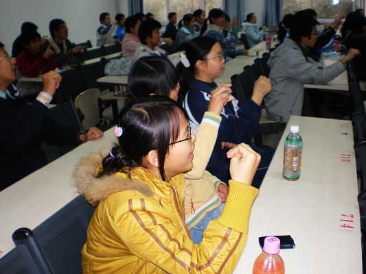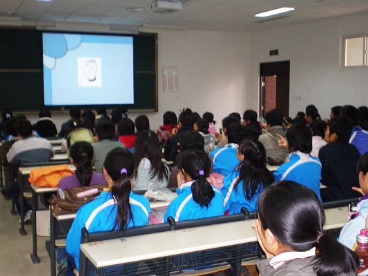 活动开始后,我们的手语老师为我们简单介绍了一下手语的种类。整个教室座无虚席,活动过程中手语老师教了字母,数字,颜色等一系列词的手语打法;然后为我们介绍了一些有助残意义的短片。