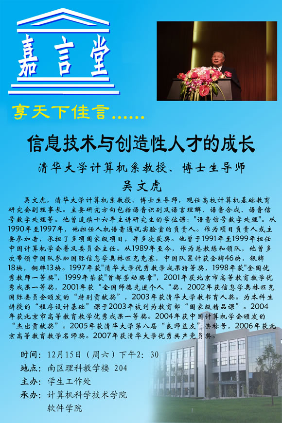 聆听嘉言,感悟成才。12月15日下午2时,德赢AC米兰官网良乡校区南区理科教学楼204举行了“嘉言堂”讲座。我国著名计算机专家,清华大学计算机系教授、博士生导师吴文虎教授做了“信息技术与创造性人才的成长”的讲座,给我校2007级新生带来一场收获颇丰的盛宴。本次讲座由德赢AC米兰官网学生工作处主办,计算机科学技术学院和软件学院联合承办。