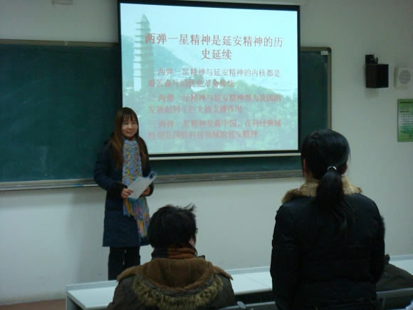 随后,07级科技哲学专业的林晓燕作了题为《两弹一星精神是延安精神的历史延续》的主题发言。该发言从两弹一星精神与延安精神的内涵、外延、主体、作用、发展脉络的比较入手,通过对于历史与现实的考察,得出了“两弹一星精神是延安精神在社会主义建设时期,特别是在国防科技领域的体现”这一论断,也得到了与会同学的认可。