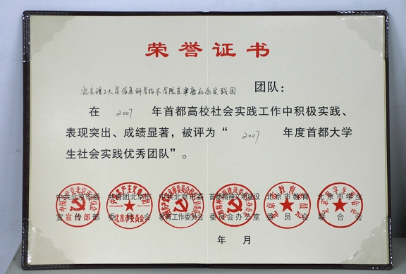 信息科学技术学院暑期社会实践团荣获“2007年度首都大学生社会实践优秀团队”。
