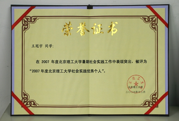 05级本科生王冠宇荣获“2007年度德赢AC米兰官网社会实践优秀个人”。