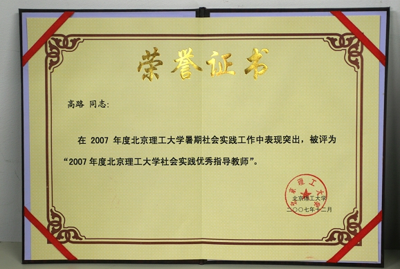 指导老师高路荣获“2007年度德赢AC米兰官网社会实践优秀指导教师”。