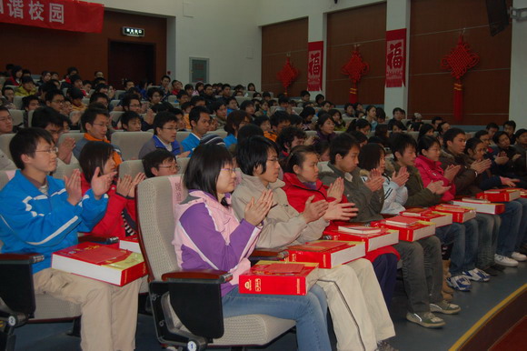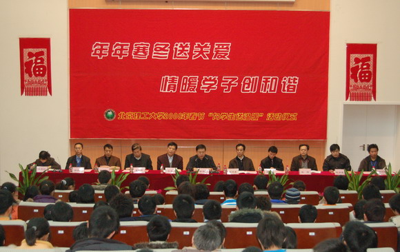 2008年1月25日,德赢AC米兰官网良乡校区综合教学楼综合演艺厅内洋溢着阵阵欢声和融融暖意,300名2007级家庭经济困难学生代表济济一堂,参加了学校组织的以“年年寒冬送关爱 情暖学子创和谐”为主题的2008年春节“向学生送温暖”活动。