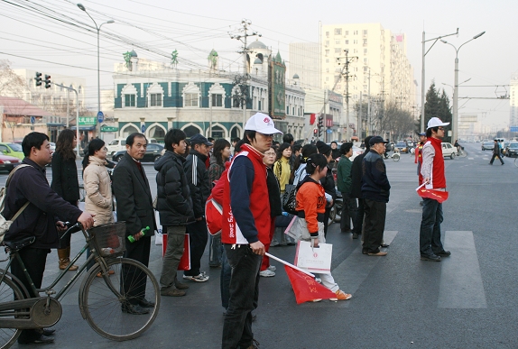 为了保证“两会”的顺利召开,协助交警维持繁华路段交通秩序。3月5日,十余名信息学院奥运志愿者在院分团委书记程斌、副书记高路的带领下,来到广安门内大街的虎坊桥、菜市口、牛街、白广路四个路口对行人和非机动车辆进行指挥疏导。