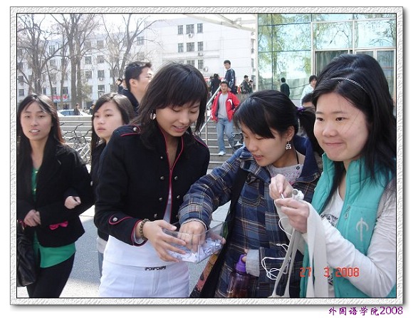 本次美食文化游园会以学生参与答题并领取美食作为活动形式,题目涉及中国、英美、德国、日本的政治经济和社会文化等常识性的知识。同学们在身着日式和欧式风格的礼仪处领取问题卡,再分别到题目所涉及的国家展台处给出答案,然后由工作人员根据答案的正确与否赠送相应国家的特色小点心或者派发“奥运志愿者微笑圈”。