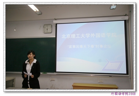 2008年4月11日,作为第三届外语文化节系列活动之一,从外语学子角度论述时事的“家事国事天下事”时事论坛活动在中心教学楼526举行。外国语学院党委书记王文清老师,党委副书记、副院长吴文君老师,分团委副书记李刚老师出席了本次活动,同时到场的还有外国语学院05、06级全体学生党员、预备党员及入党积极分子。