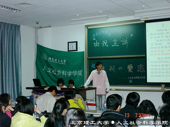 2008年4月13日07级人文学院学习部“由我主讲”学生系列讲座在良乡理科教学楼108隆重拉开了帷幕。此系列讲座是完全由学生主办学生主讲的活动,内容丰富形式新颖,为同学们提供交流学习和展示自己的平台。