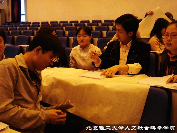 接下来进行的是由陈晗女士为我们组织的破冰游戏。在这个环节中,事先被随机分成了八组的同学们,按要求要在十五分钟内,与自己同组的同学共同协作讨论,选出一位组长,确定自己组的组名、组歌以及口号。紧迫的时间使之前还不甚熟悉的同学们都不再拘束,与大家一起分享自己的看法。随后,所有的小组轮流上台,与大家分享他们的讨论结果。同学们在游戏中找寻到了小组中的集体意识,为之后即将进行的分组讨论做好了铺垫。