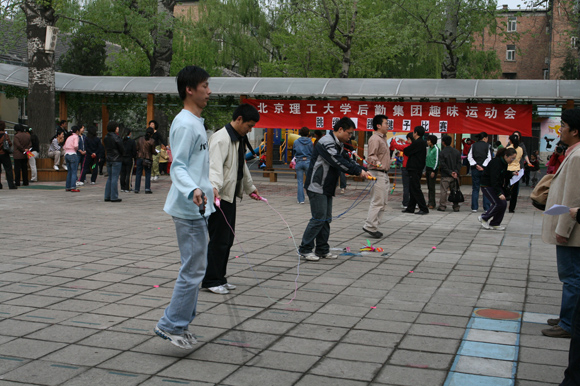 春日的北京,柳絮翻飞。参加跳绳比赛的选手们个个精神抖擞、情绪高涨,身穿运动服、脚蹬运动鞋,整装待发、跃跃欲试。在参赛选手中年龄最小的只有二十岁,最大的近六十岁。随着裁判长一声令下,比赛正式开始。跳绳的队员个个手脚配合,有的轻盈跳动,有的快速跳跃,你方跳罢我登场;他们你追我赶,不仅较量着体力,更是毅力与体育精神的角逐,竞争异常激烈,参赛者个个努力发挥自己的水平,奋力向冠军冲刺。