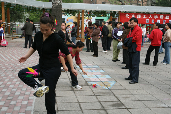 在操场的另一头踢毽子比赛同时开始了,只听哨声一响,毽子上上下下飞舞不停,有的毽子不听使唤一下子飞过来,一下飞过去,可是有的毽子却很听主人的话,要它往左它不往右,比赛不仅激烈而且趣味十足,老中青各组互不相让,喝彩声络绎不绝。经过精彩激烈的角逐,共决出优胜奖26名。