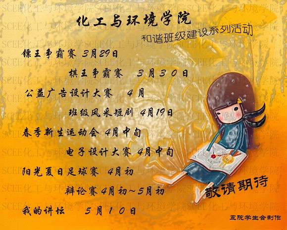 4月12日,化工与环境学院2008年新生春季运动会成功举行,这也标志着良乡校区化工与环境学院和谐班级系列活动正式启动。本次系列活动将从3月底持续到5月中旬,寄希望于通过系列活动凝聚新生班级力量、展示每位新生独特的才华。