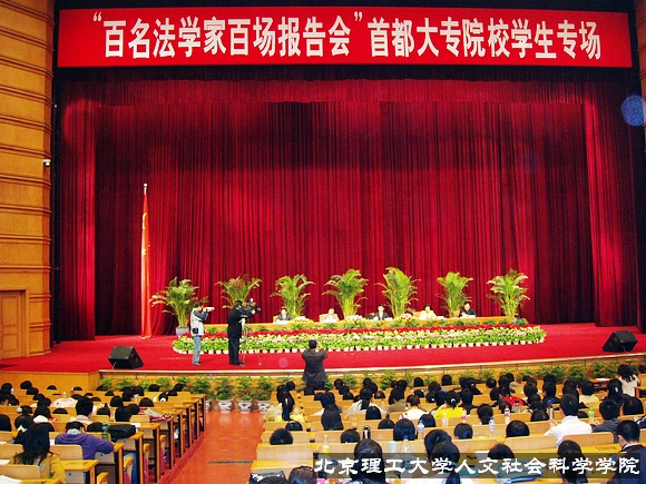 为深入贯彻党的十七大精神,宣传社会主义法治与法治理念,弘扬法治精神,推进依法治国基本方略实施,促进和谐社会主义构建,由中宣部、中央政法委、司法部和中国法学会联合举办包括此次报告会在内的已在全国开展两年的一系列“双百”活动。