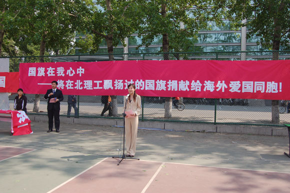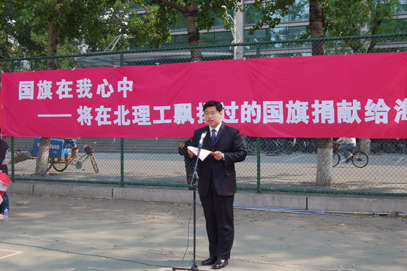 “同学们,每一个热爱祖国的人心中都有一面国旗! 当我们把在北理飘扬过的国旗捐献给海外爱国同胞后,我们应该加倍珍视我们心中的那面鲜艳的五星红旗,在她的指引下,将爱国之情化为报国之志,并最终转化为强国动力;让今天北理校园中的五星红旗,永远飘扬在我们心中。让我们在党的亲切关怀和正确领导下,以振兴中华为己任,为中华之崛起而发奋学习!用科技强国、用知识报国!力争早日成才、成为社会主义的合格建设者和可靠接班人;用自己的智慧和力量使我们的祖国日益强大!”