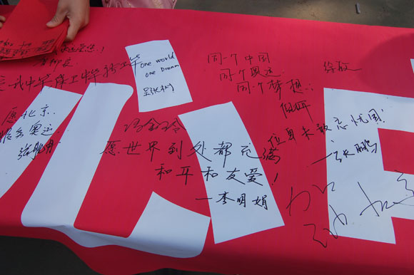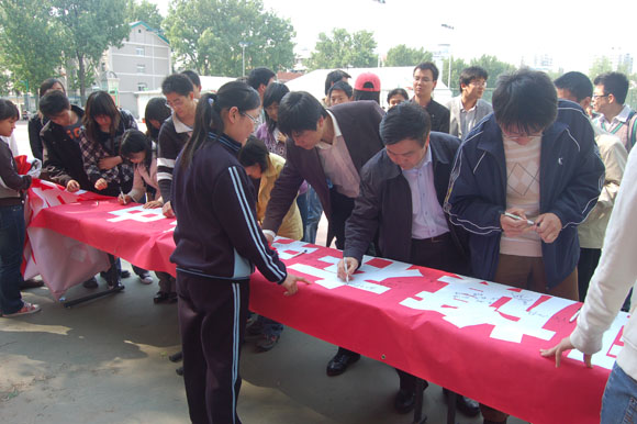 活动的最后参加活动的师生陆续在印有爱国口号的横幅上签名。