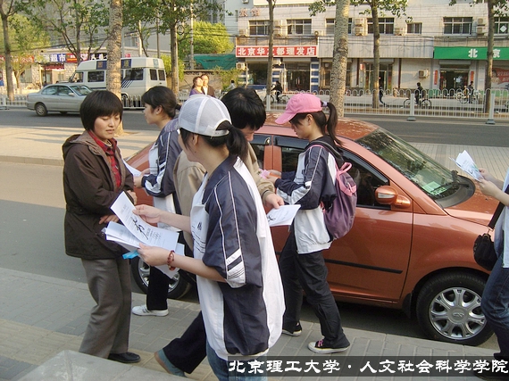 我校志愿者与中财的志愿服务队步行前往中央财经大学,沿途进行奥运宣传,通过发放奥运知识测试题、知识手册和传单等方式,增进市民对奥运的进一步了解和关注。