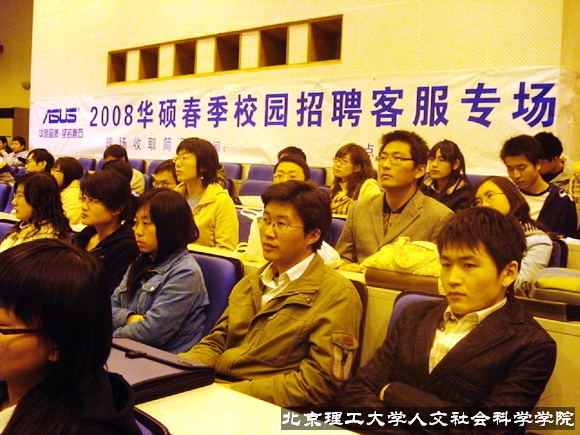 3月27日,人文学院机遇发展协会携手华硕举办了2008华硕春季校园招聘会。27日下午2:00至6:00,在主楼240协会成员负责现场收简历并现场解答同学们的一些相关问题,华硕工作人员现场筛选简历。晚上7:30至9:00在7号楼报告厅,华硕HR现场宣讲,介绍华硕企业文化以及此次招聘的相关职位。宣讲会后宣布比试名单,由机遇发展协会组织比试。