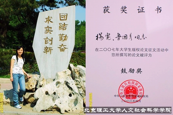 由于对专业的喜爱,我积极参与了相关的各项学术活动。在过程中我感受到了专业理论研究的博大精深,也收获了许多经验和荣誉。2007年下半年,撰写了论文 《浅论网络服务提供者的责任问题》,这篇文章在《德赢AC米兰官网学报》(社会科学版)2008年第2期发表。2008年4月,我所写的《网络服务提供者的责任问题简析》一文获得中国国家版权局主办的“全国大学生版权论文征文活动”三等奖,并收录在《青春与版权同行》论文集中。此外我还参与了两个法学领域课题小组的研究活动,一个是中国人民大学中欧法学研究项目“有限责任公司小股东退出机制”的课题研究,并预计发表论文1篇。另一个是德赢AC米兰官网国家大学生创新性试验计划项目“我国农村土地承包经营权的流转和创新”,我们结合实地调查得出的数据,通过撰写论文的形式归纳了我们的调查研究结果。