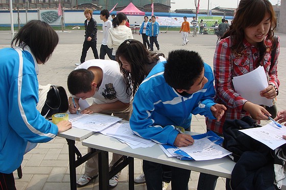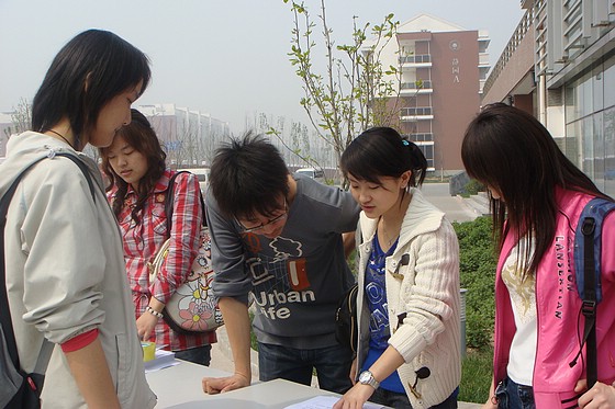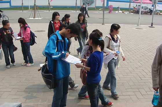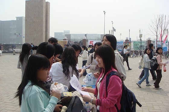 4月15日中午,宣传部同学在食堂外做了外场宣传,当天十点开始布置场地,挂出了彩喷,设立了报名地点,大家积极,热情地宣传,共发出六百张宣传单,有 100多位男生报名大众评审,十多位女生报名参赛,基本达到预期计划。场面热闹非凡。