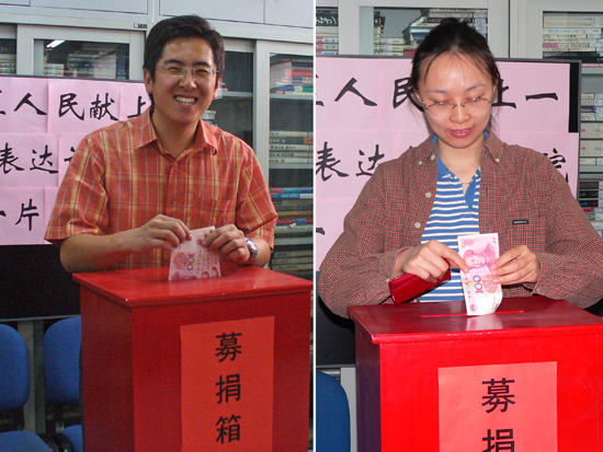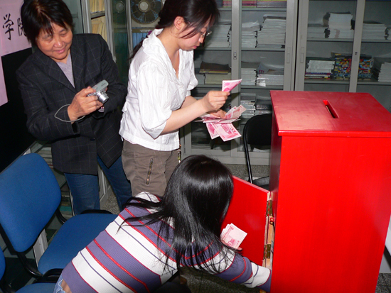 5月12日发生在四川省的特大地震灾害牵动着全国人民的心。我校设计艺术学院广大师生密切关注灾区灾情,心系灾区人民,积极支援抗震救灾。为了方便教师捐助赈灾,设计艺术学院14日下午2时开始在学院资料室设置募捐箱。截止当日下午5时,已经募集到善款13400元。分党委书记李莲、院长张乃仁带头捐款,短短3个小时内就有59位教师慷慨解囊,人均捐款220元,超过许多教师一天的工资。目前捐款活动仍在继续。