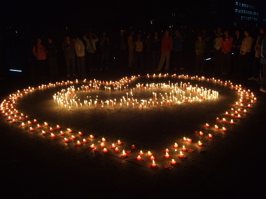 现场每位同学手持一支蜡烛,没有灯光,没有喧嚣,有的只是北理学子对灾区人民发自内心的哀悼与祝福。同学们用手中的蜡烛点燃了地上摆放着的红色心形蜡烛和“5.12”字样白色蜡烛,安静的烛光映红了同学们尚未成熟却带有一丝忧伤的脸庞。大家一起唱起了《让世界充满爱》后,一切都沉静下来,只剩下烛火被风吹动的哧哧声,这时,所有同学都在静静地为死去的亡灵默哀三分钟。现场的每一位同学都十分感动,都为灾区而默默地祝福。