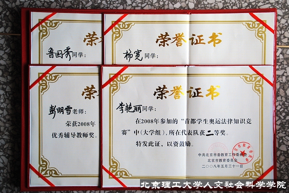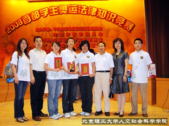 2008年5月31日下午两点,2008首都学生奥运法律知识竞赛大学组决赛在史家小学礼堂隆重举行,我校党委宣传部部长贺亚兰、人文学院党委书记张剑军、人文学院副书记副院长贾利军亲临比赛现场加油助威。人文学院05级法学专业杨宽、李艳丽、鲁国秀三名同学代表我校出赛,同北京航空航天大学、北京第二外国语学校等五所高校代表队一起,开始了激烈角逐。代表队最终不负重望,获得二等奖的好成绩。奥运法律知识竞赛在由人文学院2006级40名同学组成的啦啦队喊出的响亮口号——“法治中国,和谐奥运,激情北理,青春飞扬”中开拉了序幕。经过一个月的紧张备战,杨宽、李艳丽、鲁国秀三名同学在赛场上信心十足,在必答题、抢答题、风险题三个环节中沉着冷静、团结合作,从容应对多变的赛场形势,他们的精彩表现赢得了全场观众的热烈掌声,并终以优异成绩获得二等奖。