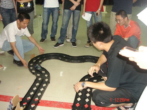 最后,精彩激烈的跑道赛开始了。跑道赛定为10圈,中间允许更换电池,但计时间。若速度太快冲出跑道,时间暂停,都由此带来的时间误差及车子损坏由参赛选手自负。比赛中,只见每辆四驱车在跑道中疾驰,不禁让人担心车子会飞出跑道。果然,当跑到最后几圈时,有的车子就一下冲出跑道,或者因速度太快造成马达受损和轮胎脱落。如此看来,还真有点F1的味道。但选手们毫不气馁,迅速作出调整来完成剩余比赛。