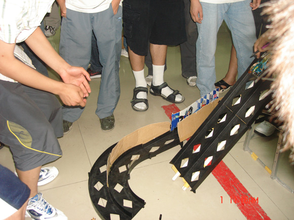 令所有人惊讶的是,当坡度升至近80度时,竟然还有四驱车缓慢爬上坡顶,赢得了在场所有人的一片惊呼与喝彩。这就叫做开拓创新潜力无限,只要认真钻研,就一定能够推陈出新。在爬坡赛结束之后,我们进行了中场休息,让选手们为最后的跑道赛做准备,给他们充足时间调整马达、轮胎等四驱装置。期间,我们对选手们创造的介绍自己车的广告进行了评比,并由分团委姚老师进行了点评,每幅广告作品都赢得了阵阵掌声。
