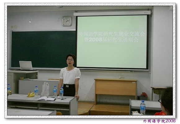 6月16日晚,外国语学院举办了外国语学院研究生就业经验交流会暨2008届研究生送别会。外国语学院07级全体研究生及06级部分研究生代表参加了此次活动。外国语学院党委副书记、副院长吴文君老师和外国语学院分团委副书记李刚老师出席交流会。