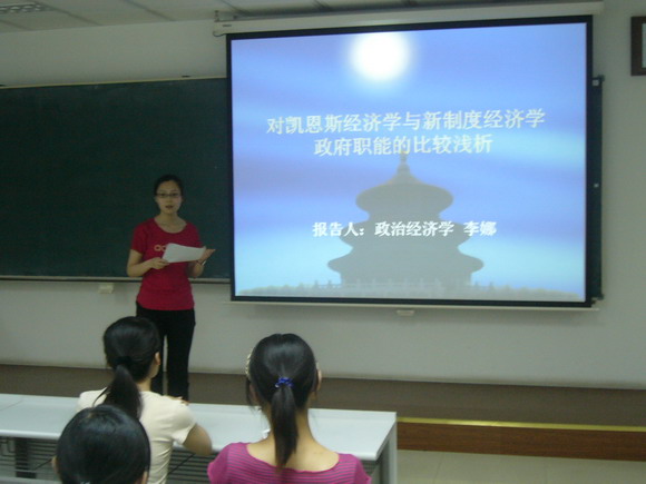 首先,由在此次论坛中论文获得三等奖的明金花同学与李娜同学分别做题为《美国的战略石油储备体系及对我国的启示》和《对凯恩斯经济学与新制度经济学中政府职能的比较浅析》的报告。在明金花同学的报告中,主要以美国石油的生产和消费状况为背景,重点介绍了美国石油的战略储备体系,并且指出我国应借鉴美国的先进经验,从而进一步完善我国的战略石油储备体系。在李娜同学的报告中,主要以凯恩斯主义经济学与新制度经济学中政府职能相关内容为出发点,分析了资本主义国家与社会主义国家不同经济制度下政府职能的共通与差异之处,并以此作为我国政府职能转变和建立公共服务型政府的借鉴。