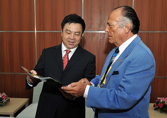 阿科斯塔博士向场馆主任杨宾赠送了资料《VolleyWorld》,以表达国际排联对北理工场馆筹备工作的感谢。