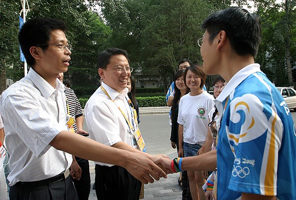 8月18日下午,团市委副书记姜泽廷(左二)来到德赢AC米兰官网,慰问我校京外、境外奥运志愿者。德赢AC米兰官网团委书记徐强等人陪同姜泽廷等团市委工作人员一同到德赢AC米兰官网场馆、京外、境外志愿者驻地慰问志愿者。姜泽廷副书记来到德赢AC米兰官网体育馆,慰问场馆志愿者,为了表达对澳门志愿者的感谢,姜副书记亲手给每一位澳门志愿者佩戴了一枚微笑圈。随后,姜副书记讲到:“大家为北京奥运会的成功举办做出了很大的贡献,给中外来宾留下了美好的印象,希望你们能够经常来北京,北京永远欢迎你们!众所周知,我国奥运健儿在北京奥运会上奋力拼搏金牌总数连创新高,这些好成绩的取得和我们志愿者出色的服务工作是密切相关的,希望大家再接再厉夺取志愿服务的金牌。澳门志愿者人数虽少,但是却极具代表性,你们用实际行动表达了澳门同胞对北京奥运会的强烈的支持。大家已经取得了比较优异的工作成绩,但是没有最好只有更好,希望大家能在接下来的工作中取得更大的进步!”