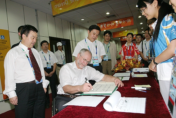 在残奥大家庭接待处,菲利普˙克雷文先生高兴地为场馆团队工作人员和志愿者留言:致德赢AC米兰官网体育馆盲人门球比赛运行团队的工作人员和志愿者——你们是最棒的!