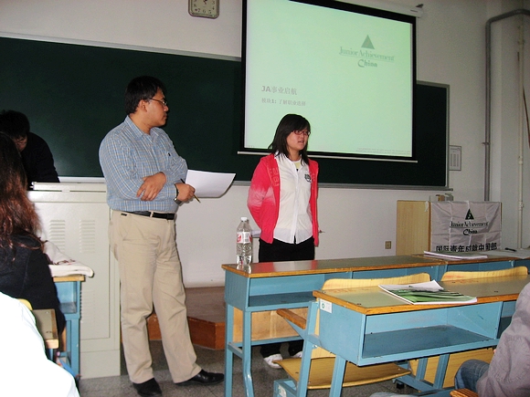 接下来,这次课程志愿者的组长,来自壳牌的志愿者郭强为志愿者们简单的介绍了一些这次常规课程CG的课程安排。之后,学员观看JA学院相关介绍的视频。