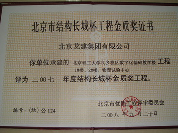 良乡校区基础教学楼工程、1号楼、2号楼、物理实验中心金质奖杯