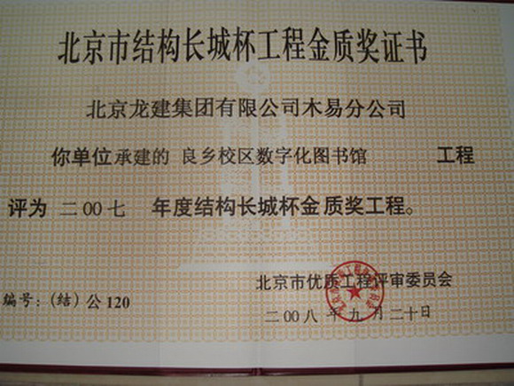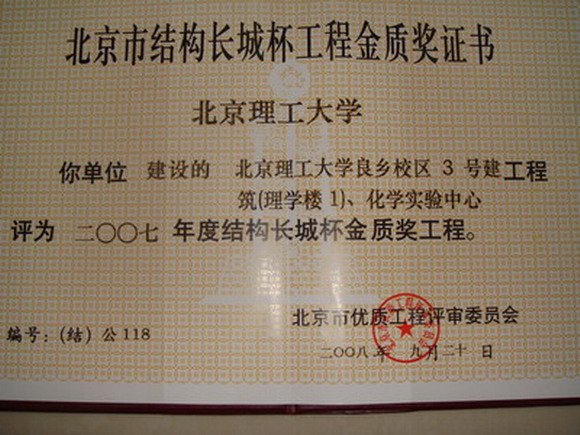 德赢AC米兰官网良乡校区3号建筑(理学楼1)、化学实验中心,良乡校区3号学生公寓D、E工程,良乡校区数字化图书馆工程和良乡校区数字化基础教学楼工程、1号楼、2号楼、物理实验中心被评为2007年度北京市建筑结构长城杯工程金质奖。