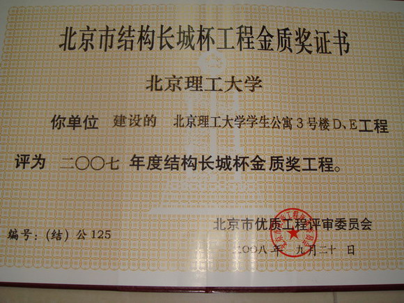 良乡校区3号学生公寓D、E工程金质奖杯